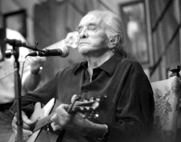 Cash took a seat in a chair in the center of the stage. On either side, his band, led by his son John Carter Cash, began playing “I Walk the Line.” After he sang it, he held up his hospital-bruised hands toward Heaven. “That was for you, baby,” he said. Between the songs that followed, he talked about the love he had for June, and how it hurt to lose her. We were all standing in the door of the green room watching him preach a sermon about love. Cameras were flashing, and people were calling out to him. At one point, someone all the way in the back yelled, “We love you, John!” He stopped, looked at them and said, just how you would expect Johnny Cash to say it, “I love you, too.”