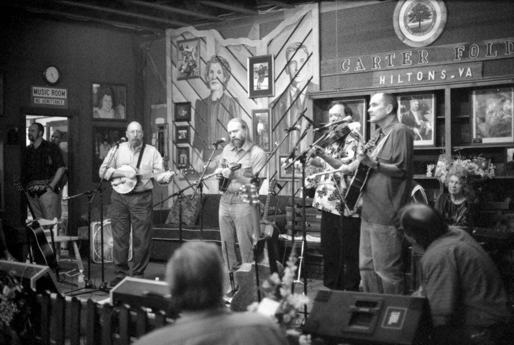 June 21, 2003 was set to be the first show I ever played with Mike, Bill, and Jim, founding members of the Red Clay Ramblers. I was excited as I could be about that, but things took a surreal turn when Watson called me the week of the show, saying, “Janette Carter called and told me that Johnny Cash is visiting Hiltons, and wants to come ‘play for June’s people.’” June being June Carter Cash, who had died the month before. Janette told Watson that Cash would do a short set, then we would take the stage.